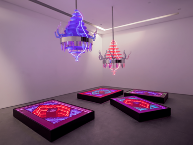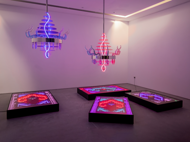 In this collection of light sculptures, Soheil wants his audience to feel free, playful and connected. He invites them to a mystical dance with the rainbow colors of his artworks, from red of the root to purple of the crown. He inspires people to undertake this transformative journey from the arabesque patterns of the carpets on the ground to the chandelier on the ceiling. Through the usage of patterns and colors, he takes a rather mystical approach of connecting to the higher self which leads to unity with the universe. Rad hopes for the audience to experience his own journey of engaging with self and awareness with a spirit of nonjudgmental curiosity.///