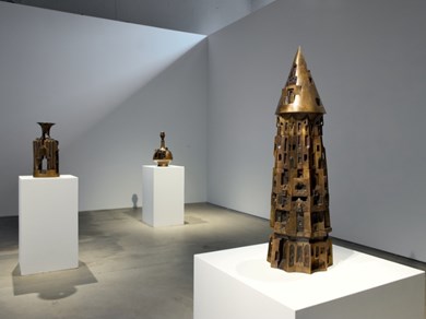 Through a series of intricate and detailed bronze sculptures, the artist seeks to uncover the roots of the collective identity of the region’s past through multi-layered architectural structures that blend pottery elements with fragments inspired by Iranian architecture.