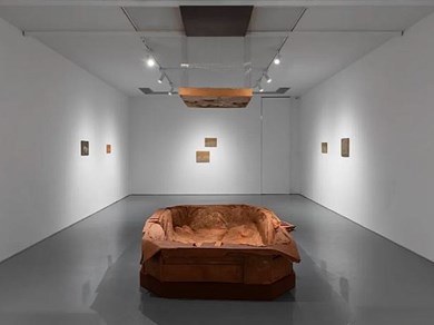 The large-scale installation in the center of the gallery space is the negative derivation of a formed sculpture. The indistinct human outline suggests a story forgotten by time; for its whispering, reminds us about those fading memories, the disappearance and the oblivion in life.