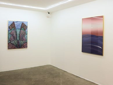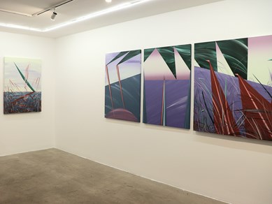 Sharp, prism-like geometric forms interrupt the ground of smooth and subdued natural landscapes in the canvas & cardboard works of Farbod Elkaei.