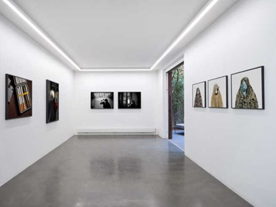 The exhibition then continues with the celebrated series Like Everyday (2002), one of her most famous works. Women dressed in floral chadors are portrayed with modern kitchen utensils in the place of their faces, showing the heritage of a culture with strong contradictions and social incoherencies.