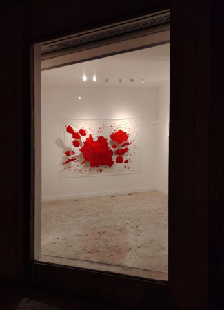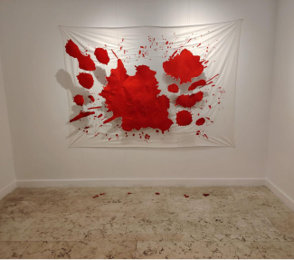 A red, before it blackens and cools, like the view of a field once a slaughter ground for countless victims, is stretched upon the wall. This is a portrait of life within the panorama of vibrant meadows of existence.