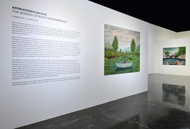 Canoes floating past abandoned settlements, archways half submerged within the sea, miniature figures lost within dense forests. Iranian artist Amirhossein Bayani’s vividly coloured and highly detailed paintings explore themes around life, immigration, and freedom with a particular focus on the struggles of women.///