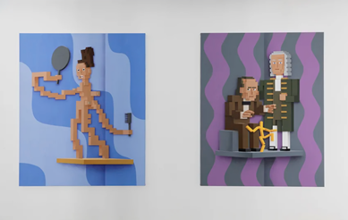 This new series, conceived as a passage, brings together characters who are themselves wandering — figures from literature, music, or art history, as well as doubles of the artist, all pixelated, fragmented, recomposed.