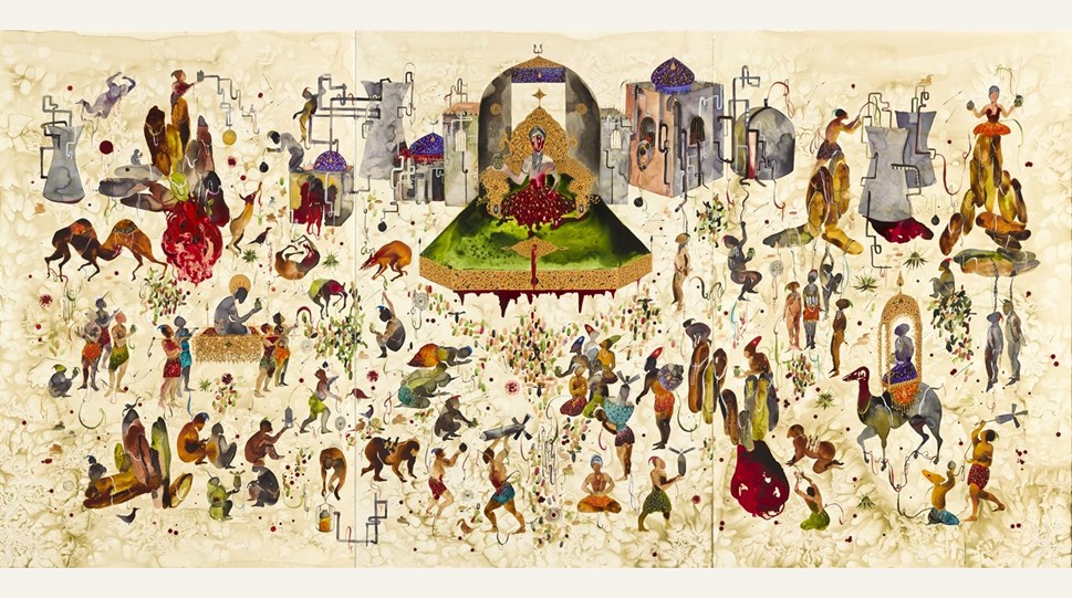 شیوا احمدی | پناهگاهِ ایمن | 1391 | آبرنگ و جوهر روی تخته | 152.400 × 304.800 | از مجموعه دائمی موزه هنرهای معاصر لسآنجلس (موکا)