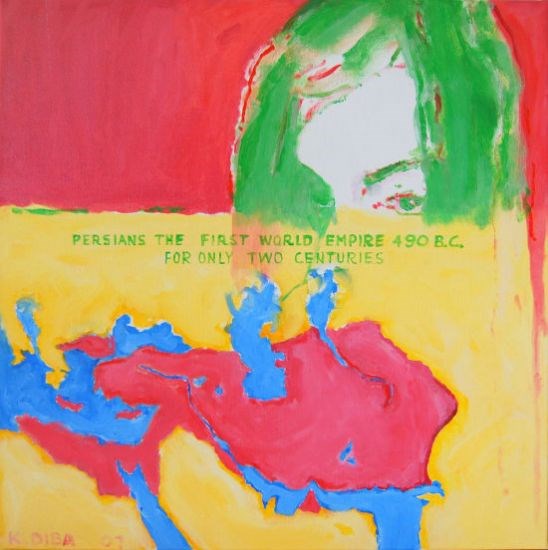 در مجموعهی بعدی که اثری با عنوان «آبی بر روی سبز» (به تأسی از نامگذاری کارهای مارک روتکو) در آن وجود دارد، دیبا با الهام از مکتب سقاخانهی آنزمان ایران و بیشتر نقشمایههای نوشتاری و پالت رنگی آن و همینطور استقرار و استحکام فرمیـرنگی کارهای روتکو به خلق آثاری دست زد. او کلمه و خط را نه از جنبهی مفهومی و معناییاش، که از جهت فرم تکرارشوندهی آن (طوری که اغلب ناخواناست) مورد استفاده قرار داد. انگار کلمات و نوشتههای متحرک با دیواری نامرئی که دورشان کشیده شده، گرد هم آمدهاند و تودهای گیرافتاده و شناور را در بستر رنگی خالص ایجاد کردهاند. ادامهی این کارها که اغلب با تکنیک رنگوروغن بودند، کارهایی با تکنیک پاستل است که در آنها، دیبا این توده را با کمک توان طراحی خود و بازنمایی کاغذهای پاره (شبیه به کاری که آیدین آغداشلو در مجموعهی انهدام خود کرده است) از هم میگسلاند و دوباره کنار هم قرار میدهد؛ بازآفرینی همان ایدهی آرمانیـمکتبی پلورالیسم بهنفع آزادیهای خالص فردیِ خودجدا از جزماندیشی (دُگماتیسم) ساختارگرای مدرنیسم اروپایی.
