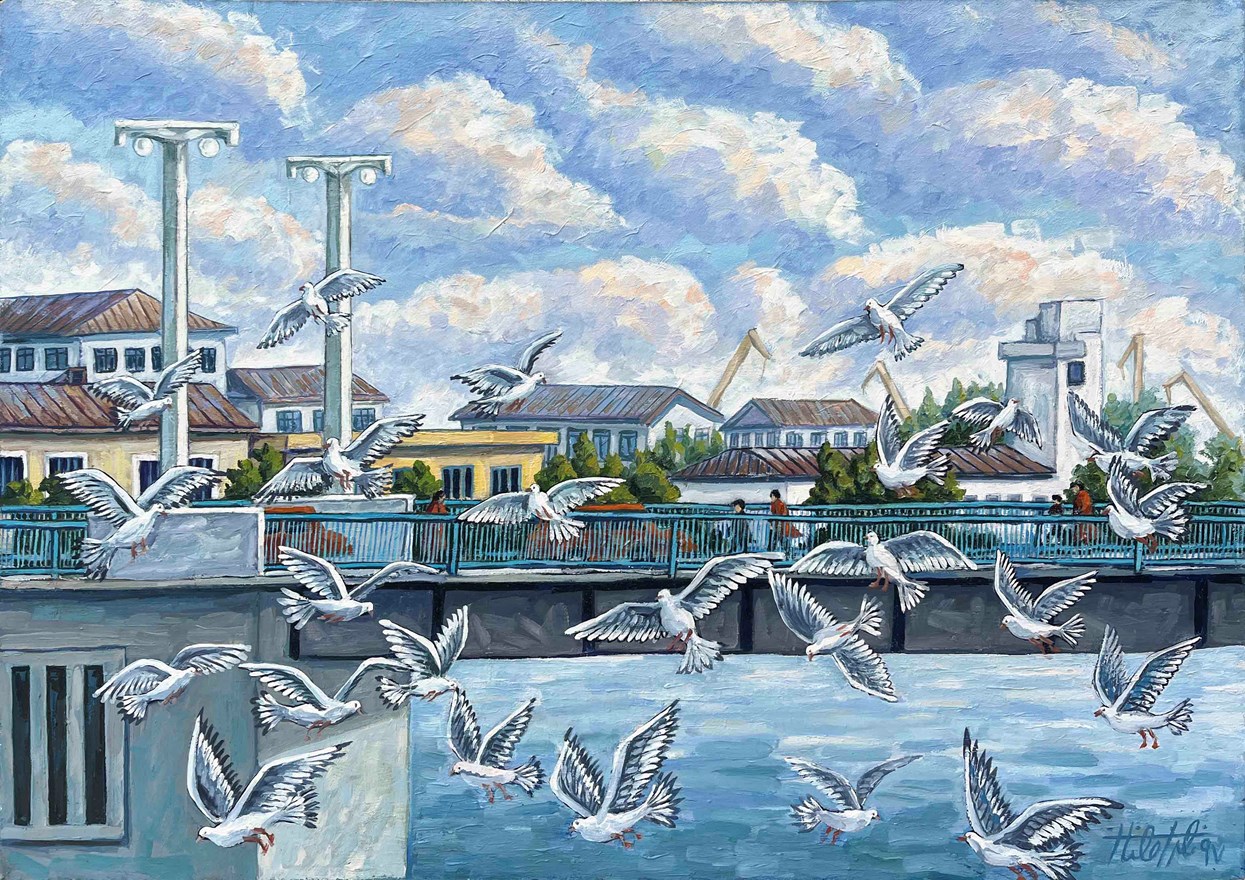 از سوی دیگر، برادران قاسمی که متولد بندر انزلی هستند، بهجای بازنمایی روزمره یا نگاه از جایگاه یک ناظر، تلاش میکنند ارتباطی حسی با مخاطب برقرار کنند. آثار این دو هنرمند بیشتر نشاندهندهی اتمسفر و حسوحالی است که از محیط پیرامون خود میگیرند. آنها با رنگگذاریهای ضخیم و انتزاعی، فضایی وهمآلود از اتمسفر زیستهی خود را نمایان میکنند.