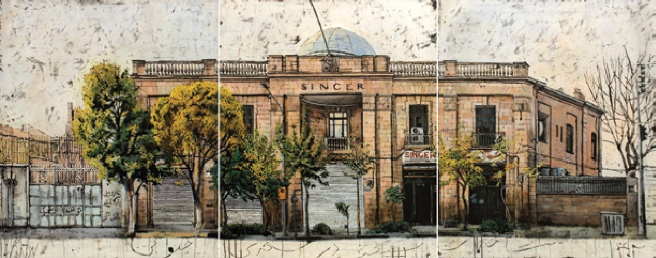 مرجان نعمتی | ساختمان سینگر در خیابان سعدی | 1402 | رنگ روغن روی بوم | 120 × 300 سانتیمتر