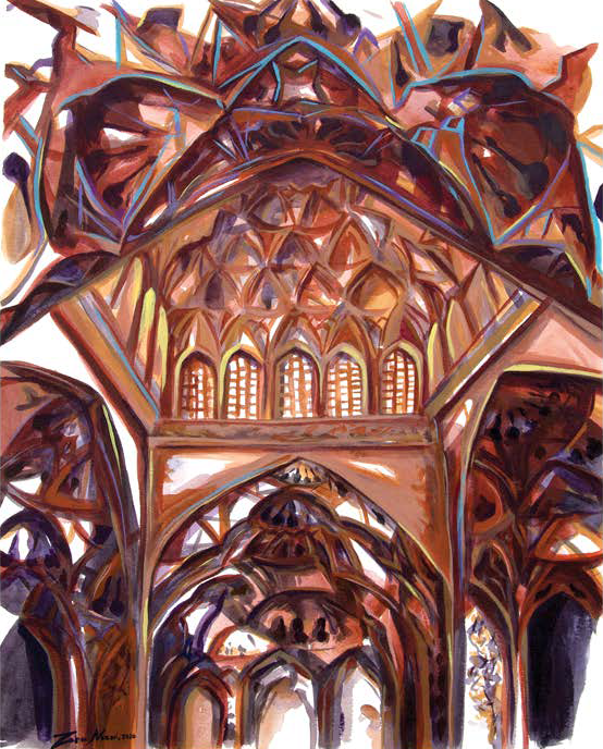 در کنار این سیاق، زهرا نظری با نگاهی انتزاعی بر مناظر شهری محل زندگی خود (بهخصوص عناصر معماری آن) دقیق شده است. او تلاش خود را بر بازنمایی کلیت سازههای سنتی شهر گذاشته و علیرغم محدود بودن جزییات در بازنمایی، مطالعهای دقیق در فرم سازه (و خود اثر) ایجاد کرده است؛ بهطوری که گویی دست به شالودهشکنی در ساختار معماری میزند.