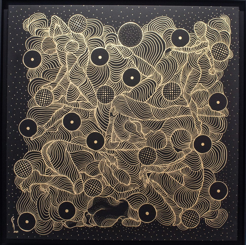 مبینا نوری | «رقص ایمان» | جوهر روغنی طلایی روی بوم | 109× 109 سانتیمتر | 2024