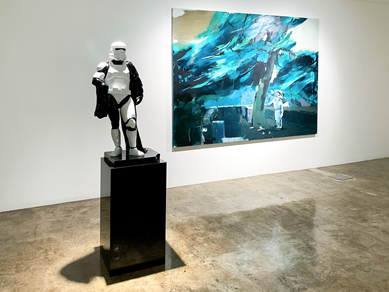 امیرحسین زنجانی در مجموعهی «منجی» و در ادامهی پروژهی میلیتاریسم به دنبال تاریخی بدیل است که این بار از زبان شکستخوردگان بازگو میشود. او که همواره در آثارش رویکردی کنایهآمیز و نقادانه به موضوع جنگ و نظامیگری داشته است، در این مجموعه با کنکاش در آثار مهم و شاخص تاریخ هنر از دلاکروا تا مونه، سعی دارد وقایع زمانهی خود را با وام گرفتن از آن تصاویر با رویکردی پاپ در پالت رنگی محدودی بازآفرینی کند. امیرحسین با کولاژ تصاویر مستند خشونت و جنگ و استفاده از شمایل جنگ ستارگان، سرکوب و کشتار بشر را با وعدهی آزادی و دموکراسی به پرسش میگیرد. اگر استورمتروپرهای جنگ ستارگان آفریده شدند که بهعنوان اسطورههای معاصر در قرن سیاه جنگهای جهانی، رابطهی خیر و شر و مسئولیتهای بشر را به او یادآوری کنند، در آثار امیرحسین بهگونهای هجوآمیز در نقش یک منجی مدعی اما پوشالی ظاهر میشوند.///