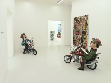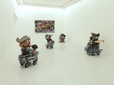 نمایش اخیر علی ملک متشکل از دو مجموعهی کبوترهای نامهبر و خودروسوارانی که چشمهایشان از حدقه بیرون زده است.